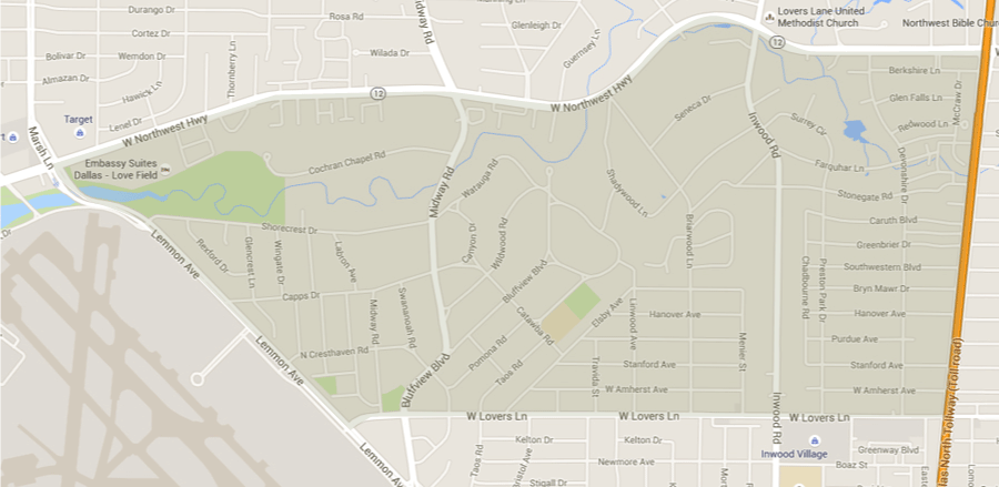 The neighborhood of Bluffview is loosely defined as the area bounded by Northwest Highway on the north, Inwood Road on the east, Midway Road on the west and Lovers Lane on the south. Distinguished by a 60 foot cliff of Austin chalk rising above Bachman Creek, many Dallas residents think of Bluffview as the "Hill Country" of Dallas.